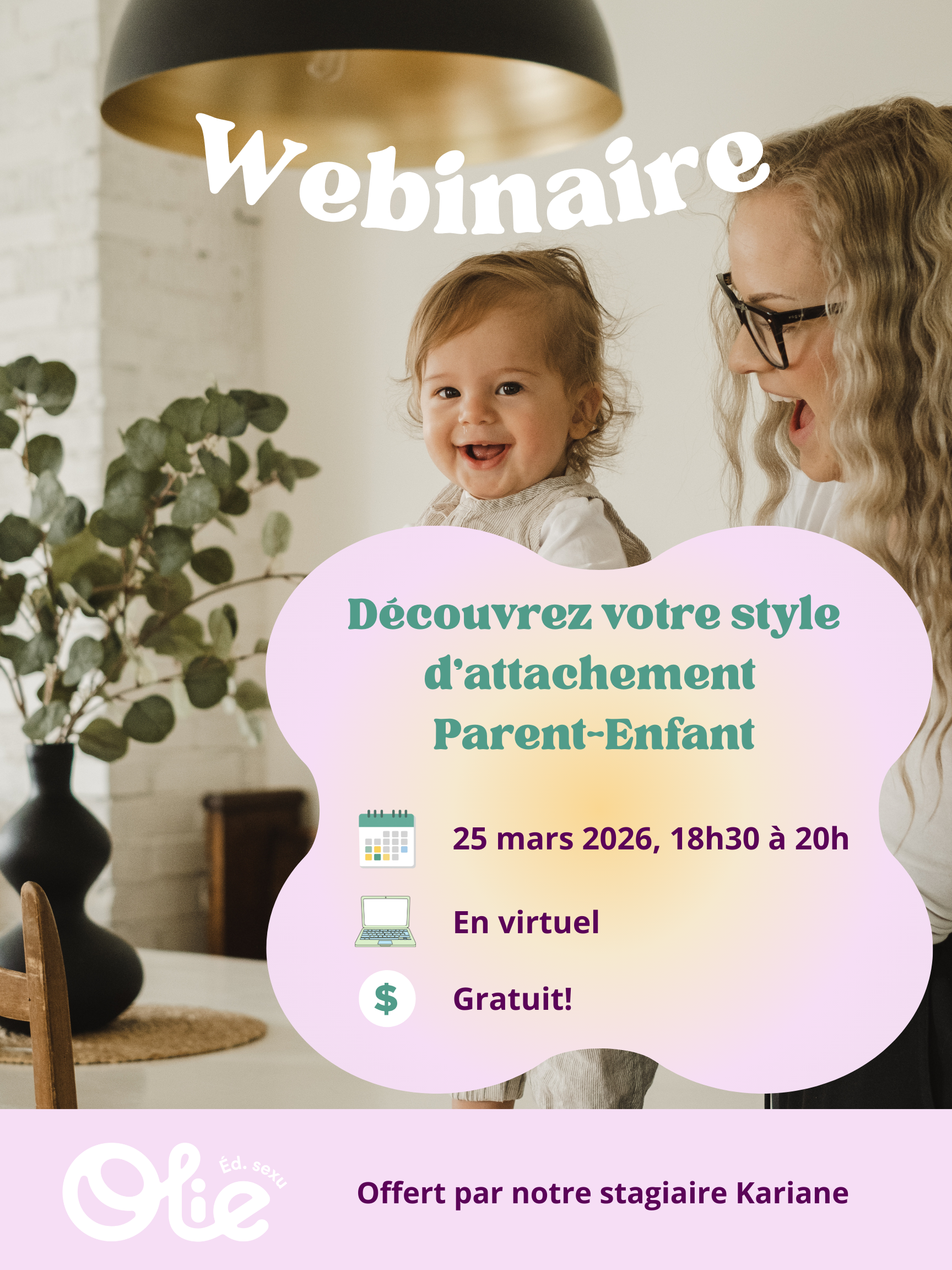 Atelier gratuit d’éducation à la sexualité portant sur l’attachement offert par Kariane Myre, stagiaire chez Olie Éducation et finissante au BAC en sexologie de l’UQAM.